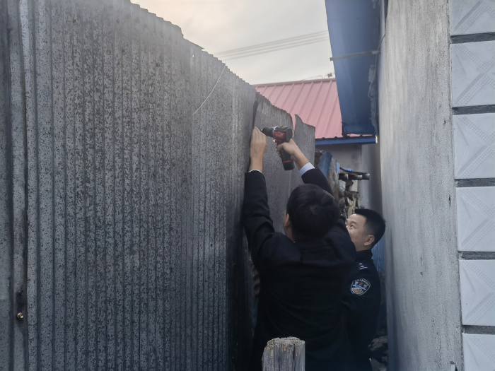 取得理解后,干警们没有袖手旁观,而是纷纷上前,动手改造这道斜伸的房檐。