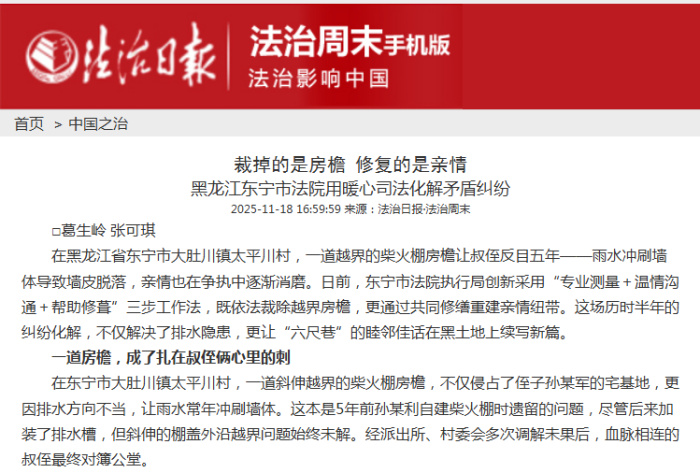 11月18日,《法治日报》刊发东宁法院以《裁掉的是房檐 修复的是亲情 黑龙江东宁市法院用暖心司法化解矛盾纠纷》为题的文章。